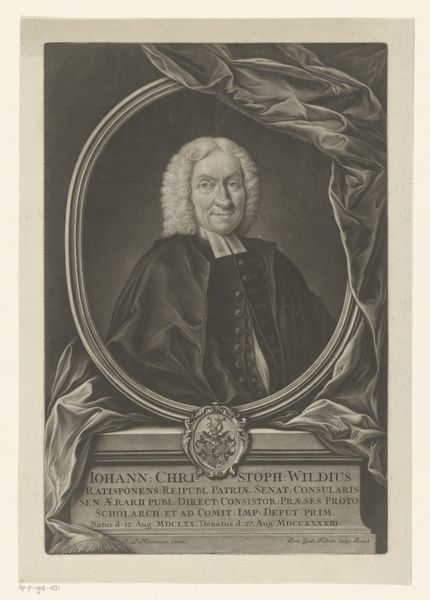 Editor: We’re looking at Johann Martin Bernigeroth's "Portret van Christian Reineccius," created in 1753. It's an engraving on paper, currently held in the Rijksmuseum. The level of detail achieved just with engraving is incredible. What stylistic choices do you think contribute to its overall effect? Curator: The density of hatching is certainly noteworthy. Observe how Bernigeroth manipulates the lines, their proximity and direction, to create tonal variations that model form and simulate texture. The Baroque frame itself reinforces this, using a decorative structure, but drawing your eyes immediately to the crisp linework on Reineccius. How does the subject of the artwork itself function in this context? Editor: You mean besides Reineccius being clearly important enough to be the subject of a portrait? Curator: Precisely! Consider how the composition itself reinforces our understanding of the sitter. Notice the relationship between the figure, book, and crucifix, drawing a linear perspective to highlight those elements as of critical interest to understanding Reineccius as a scholar. Can you explain it in other words? Editor: I guess the open book draws attention to him being learned and the crucifix to the background implies his faith? Does that work in the formalist approach? Curator: Certainly! Also, how the cascade of drapery behind the figure, rendered through gradations of etched lines, directs your gaze towards the sharp contrast defining Reineccius. Through these formal techniques, we are provided a rich and detailed study of subject and craft. Editor: It's fascinating how focusing on form reveals so much. Thanks for showing me how to unpack this using the formalist method. Curator: Indeed. Paying attention to such minute visual choices really allows one to consider artwork, at the time or in present, for its structure, composition and materiality.