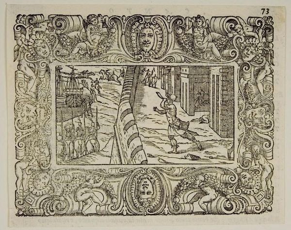 This small woodcut, titled "Graaf Floris (V?)" currently residing in the Rijksmuseum, presents a stark, linear scene. The composition is dominated by horizontal lines, from the rigid bed frame to the parallel strokes indicating texture. This horizontality creates a sense of stillness, disrupted only by the diagonal thrust of the body and the vertical lines of the surrounding architecture. The anonymous artist uses line not just to delineate form, but also to convey mood and meaning. The coarse hatching suggests a somber atmosphere, appropriate for the depiction of a deceased figure. The linear style is reminiscent of early printmaking, where clarity and reproducibility were prioritized. The limited tonal range further emphasizes the starkness of the scene, highlighting the geometric simplification of forms. By reducing the figure and setting to a network of lines, the artist invites us to contemplate the underlying structure of representation and the symbolic weight of linear abstraction. How do the artist's choices in the composition and line work evoke both loss and stoic acceptance?