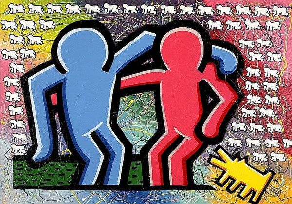 Editor: Here we have "Brugbord betreffende het Volkspetitionnement 1 november 1985," potentially from 1985, by Carolien Perdeck. It seems to be a painting in a cartoon-like style depicting people carrying scrolls or documents to someone who looks like royalty. What strikes me is the strong social commentary feel – what’s your take? Curator: Indeed, it feels very much rooted in a specific socio-political moment. The title mentions a "Volkspetitionnement," which translates to a people's petition. This piece likely critiques how such petitions, expressions of popular will, are received and processed within institutions of power, symbolized here by the royal figure. What kind of visual cues suggest caricature to you? Editor: Well, the exaggerated features of the characters, and almost comic style of representing them makes the whole image feel like caricature. Curator: Exactly! The artist exaggerates those features to comment on a particular set of behaviours or even an entire class, wouldn't you agree? Perhaps think about it as not only a snapshot of a historical moment, but also what this reveals about the artist's commentary on social hierarchies. Editor: I didn’t consider how deeply the caricature reflects the artist’s viewpoint on social inequalities. Curator: Right! It becomes clear it's not just about the event, but about the artist giving power back to "the people" by depicting such social disparities. It also challenges the viewer to see the scene not only at face value but by looking through their own perspective, to find where their place is within this event. Editor: Thanks, I will surely be approaching artworks more thoughtfully from now on. Curator: And that is the exciting part of art, isn’t it? Never a simple reaction.