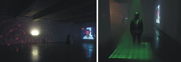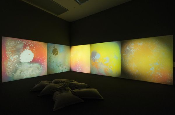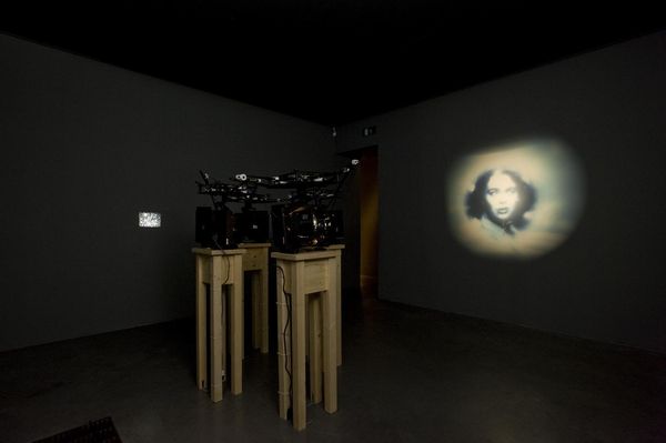 Editor: Anri Sala's "After Three Minutes" is a video installation from the Tate collection. The darkness is heavy, punctuated by these two projected images. What visual language do you see at play here? Curator: The projections themselves become like illuminated memories within this darkened space. The cymbal, a recurring symbol of reverberation and resonance, echoes the unseen. How does the interplay between the two images create a sense of cultural memory for you? Editor: The cymbal feels almost like a visual representation of sound, a lingering echo after the music stops. Curator: Precisely. It’s about what remains, the symbolic weight carried forward. The image implies continuity, a sense of connection to the past. Does the work suggest a particular cultural narrative to you? Editor: I hadn't considered the lasting impact of cultural narratives. Thanks for helping me to think about it more deeply. Curator: It's a pleasure. Images often carry more than what immediately meets the eye.