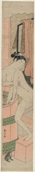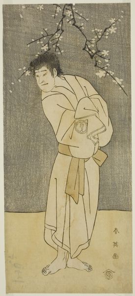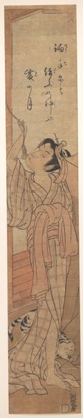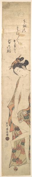 Curator: Allow me to introduce “Young Lady and Iris Garden,” an Ukiyo-e print by Chōbunsai Eishi, dating sometime between 1756 and 1829. It's now held at the Metropolitan Museum of Art. Editor: It feels… fragile. The color palette is restrained, and the figure seems almost to blend into the background, like a fleeting memory. Curator: The subject is placed within the context of iris— a material associated with feminine virtue in Edo-period Japan and featured extensively in clothing patterns for women. It evokes purity and represents traditional craftsmanship and design from that era. Editor: The iris carries further significance. Historically, in Japan, it symbolizes protection, particularly for boys. Seeing it here associated with a young woman... does it hint at hopes for her safety, perhaps even a longing for strength in a society with defined gender roles? Curator: Ukiyo-e prints were often products of a collaborative process. One artisan would create the original design, another would carve the woodblocks, and another would actually print the image. Consider the accessibility this offered: multiple copies, more affordability, leading to wider distribution and consumption. Editor: It's also striking how she's depicted, eyes downcast, seemingly absorbed by something beyond our view. The Iris might guide the viewer's eye from top to bottom and invite reflections on the inner life during an era of shifting social mores. Curator: Absolutely. The line work itself bears examination. There's a delicacy in the way her robes fall, rendered with precision, yet implying a certain lightness and grace that speaks to the level of artisanship in block carving and print-making that circulated consumer items widely throughout Edo society. Editor: It's a reminder that even in what we might consider "high art," symbols often carry coded social meanings, speaking volumes about cultural values, beliefs and hopes within society. Curator: Thinking about the labor involved, and the materials selected, offers tangible entry points. It reframes what "art" meant during this era. Editor: Ultimately, this artwork feels like a quiet meditation—a window into both personal sentiment and the collective imagination during Eishi’s time.