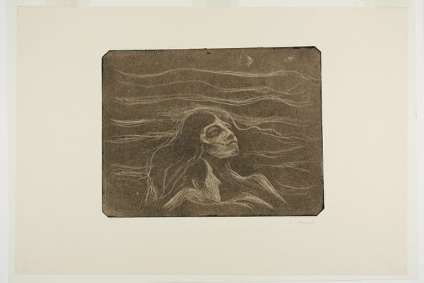 Editor: Here we have Edvard Munch's "Woman's Head against the Shore." It's a print, and the colors and composition give it a melancholic feel, almost as if the woman is merging with the landscape. What do you see in this piece? Curator: It sings to me of solitude, that very particular brand of Nordic isolation. See how the shoreline mirrors her silhouette, a kind of visual echo? Munch, bless his tormented soul, was obsessed with these themes – life, death, love, and the sea whispering secrets to those who listen closely enough. Editor: So, it's less about a portrait and more about a feeling? Curator: Precisely. It’s a mood made visible. We’re not just looking at a woman, we’re feeling her quiet desperation, the landscape an extension of her inner world. A bit depressing, perhaps, but exquisitely so. Editor: That's a different way of seeing it. I appreciate your insights! Curator: And I, yours!