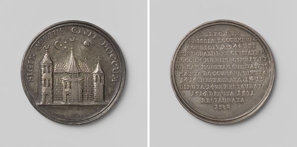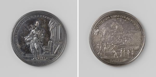 Curator: Here we have a fascinating metal relief, a wedding medal created in 1802 by Martin Holtzhey. It commemorates the marriage of Hendrik Tigges and Magdalena Anna Poursoy. The piece aligns with the neoclassical style popular at the time. Editor: My first thought is the incredible detail for something so small. The relief gives it a pronounced texture that catches the light. The image on the front feels simultaneously staged and intimate. Curator: Yes, the medal presents two distinct scenes, both rich in symbolism. The primary scene depicts the wedding itself, set before what appears to be a pipe organ in a grand interior space. Note the text bordering the top, reading "De Liefde Alleen Maakt Twee Tot Een"— "Love Alone Makes Two into One". Editor: Interesting. The organ is a complex and layered symbol. Traditionally it is associated with formal ceremony and music, yes? However, within the domestic space implied by a marriage union, the organ evokes issues around control, the voice, perhaps the historical silencing of women. I see one figure kneeling, and the other standing - are they figures of equal power within this union? Curator: The second scene, on the reverse side, features inscriptions within laurel wreaths and a pair of turtle doves, symbols of fidelity and peace. These elements carry symbolic weight; the wreaths echo ancient Greek and Roman traditions. Together the front and back serve to publicly affirm these individuals and solidify their legacy and their societal standing. Editor: It’s true - even a small, seemingly personal object like this functions within complex systems of social and political structures. This object suggests the formal structure and performativity of historical rituals concerning marriage in Western European tradition. The weight of historical practice seems to be present here, compressed onto a metal disc. What can such imagery tell us about shifting power relations within contemporary discussions of matrimony? Curator: It underscores how symbols adapt and persist across time. While the social implications may shift, the emotional resonance endures, influencing subsequent artistic expressions. Editor: Absolutely. Examining such objects allows us to appreciate the interplay between historical forces and current discourses in our visual landscape.