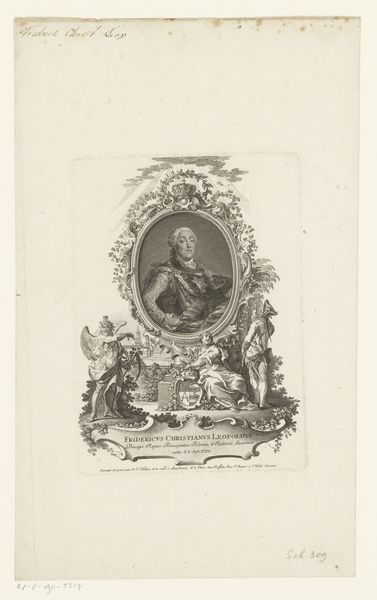 Curator: Here we have a print from 1755, "Portret van Johan Conrad Spengler," currently held in the Rijksmuseum collection. It’s an engraving of Odoard Helmont von Lode. Editor: My first impression is how ornate the presentation is. It feels like a monument in itself, even before you consider the subject. Almost aggressively Baroque, with all those flourishes and details. Curator: Exactly. Von Lode was clearly embedding Spengler, whose profession was coin and medal engraver, within a context of civic importance and artistic legacy. Notice the architectural pedestal and elaborate frame around the portrait medallion. The entire image positions Spengler as a pillar of society, his identity intertwined with his public role. Editor: And how does this public role intersect with power dynamics? Spengler, in capturing likenesses on currency, essentially participates in visualizing state authority, doesn't he? It seems important to reflect on how the visual imagery created reinforces existing class structures and celebrates those in power. Who exactly was consuming such portraits? Curator: Certainly, portraits like these functioned as endorsements, circulating images of worthy citizens within the elite circles. This engraving acted as a form of social and professional capital. The visual style also harks back to classical ideals, further legitimizing Spengler’s status by associating him with historical figures known for wisdom and leadership. We shouldn't view this imagery as neutral. Editor: No, of course not. Looking closer, the very act of framing Spengler within such grandeur speaks volumes about how those commissioning these portraits saw themselves. They controlled the narrative, deciding whose stories got told, whose faces were remembered, and, even now, which of us were in a place like this one contemplating this portrait. It emphasizes that history is not just about what happened but who gets to write it. Curator: Absolutely, by studying such works, we can uncover layers of meaning related to identity and power. Editor: It's important to bring these insights to contemporary conversations about how we represent individuals and communities today, questioning who benefits from certain narratives. Curator: Indeed. Approaching artworks in this way bridges the past and present, revealing how the social and political underpinnings of art shape our perceptions.