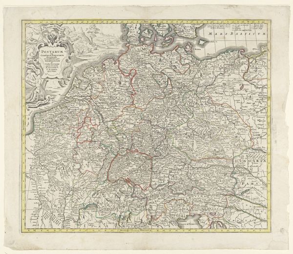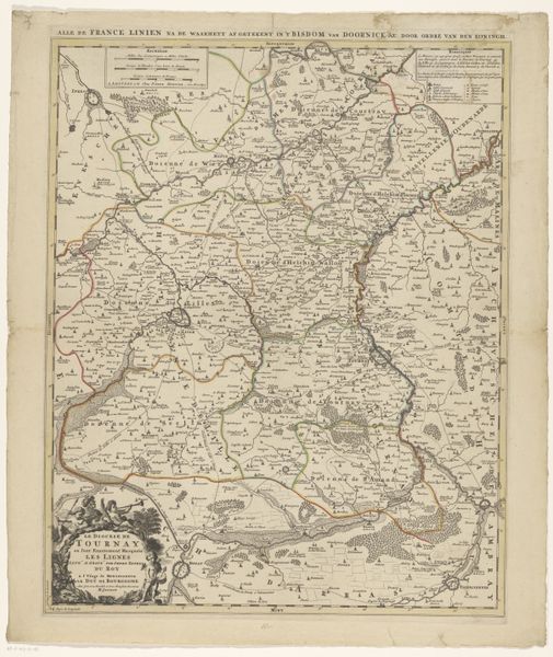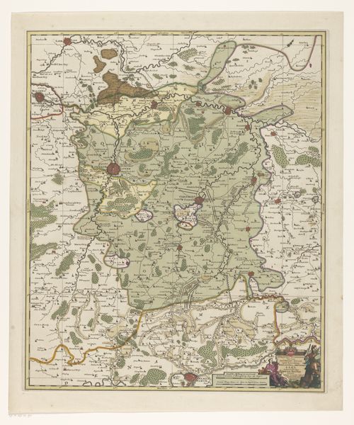 Curator: Looking at this remarkable piece, we have before us Johannes Condet's "Kaart van Gelderland," a map of Gelderland made after 1757. The work combines etching and engraving techniques on a printed medium. Editor: It has an almost dizzying quality—like staring into a meticulously crafted spiderweb. The precision! I am wondering about the human labor embedded in all of these tiny, repeated markings. Curator: Indeed, cartography in this era carried tremendous symbolic weight, representing not only geographical space but also political power and territorial claims. The map becomes a symbol of dominion. Editor: Thinking about Condet and his contemporaries, one can almost feel the repetitive strain injury building up. There must have been a market for these maps—who purchased them, and how were they consumed? Curator: Such maps were often commissioned by wealthy landowners, government officials, and merchants—symbols of their own power and influence in the region, useful in establishing dominance through visual representation of land control. The symbols denote authority. Editor: Fascinating. Beyond the high-level commissioners and patrons, let's remember the materiality. Paper wasn’t so easy to produce. The production involved harvesting natural resources and countless hands working to manufacture something both functional and, dare I say, artistic? Curator: Absolutely, the creation itself is interwoven with these various threads of social history! The visual order, in its symbolic function, brings an ordered consciousness to its users and the sense of place. Editor: The etching and engraving make it replicable. Mass production leads to broader awareness of spatial knowledge... which could certainly affect resource exploitation, political maneuvers, or social engineering? This is far from just a decorative object. Curator: Precisely. So much more than just geographical data, it is the representation and intent that infuses its meaning, touching upon power and identity. Editor: Thinking of the etcher, engraver, paper presser, map buyer... There are entire labor systems folded into this piece. A deceptively tranquil surface hiding so much complex labor beneath! Curator: This intricate 'Kaart van Gelderland' takes us into a place rich with material and symbolic meaning to reflect on its purpose and the powers it represented. Editor: Exactly. Condet's map provides a rich nexus of visual symbols and real work processes that make up a fascinating window to its world.