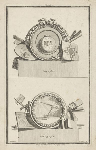 Curator: Hmm, intriguing! I get this feeling of orderly chaos. All these objects meticulously arranged but... for what purpose, exactly? Editor: That’s Jean Charles Delafosse's "Hydrografie en Geometrie", dating back to between 1768 and 1771. We're fortunate to have it here at the Rijksmuseum. It’s an engraving, a print, showcasing… well, hydrography and geometry! Curator: Okay, right, very literal. But there's something about the detail that pulls you in. Look at the top section—it's almost like a heraldic shield celebrating water or sea travel. And then, below, a more… intellectual assortment. It is a bit like finding someone's old sketch book. Editor: Precisely. Delafosse was designing architectural ornaments, so he was likely influenced by Baroque sensibilities, which valued allegory. These aren't just random items; they're symbolic. Hydrography, of course, involves mapping bodies of water; hence the charts, flags and maritime objects. The compass, that little boat! And geometry represents reason, precision: the globe, the drafting tools. The lines almost dance despite their precision. Curator: It is kind of funny that the lines of this picture feel so intentional, maybe that comes from the fact the media is so static and hard to make art with, unlike modern painting. Are those... are those trumpets in the hydrography section? Seems a bit loud for mapping! Editor: Ha! Well, you’ve nailed a quirk of the era! Think of them as symbols of discovery, perhaps, or pronouncements of newfound knowledge. Public spectacle in the age of enlightenment. Curator: So, the art, even in representing 'scientific' disciplines, still wants to impress you with importance, even grandness. Interesting. Editor: Precisely! The print bridges this gap so nicely, showing us how scientific progress at the time was inherently tied to presentation, and even a bit of theatrical flourish. Curator: It is fascinating how such a relatively simple piece, crafted with lines and paper, can hold so many layers of thought and intention. Definitely gives you something to ponder. Editor: Agreed. Delafosse captured an important intersection here – where science met society, and where art immortalized that encounter. It gives us a glimpse of their view of a changing world, and where knowledge could take them.