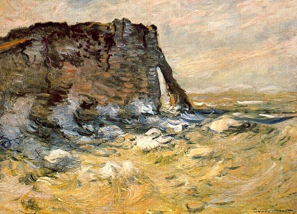 Editor: So, this is Gauguin's "Cliff near Dieppe," painted in 1885, in oil. It feels so heavy with the weight of the cliff, but also loose and airy at the top. What strikes you about it? Curator: Oh, this one. It makes me think about being caught between worlds. Gauguin was so restless, wasn't he? Always searching for something just beyond reach, like those figures perched right on the edge of the cliff. Do you think they are thinking about jumping or maybe watching the sea? Editor: Watching the sea, I hope. It seems a little melancholic to think otherwise. Curator: True. There's something in those choppy brushstrokes, that grey-ish sky. It hints at the loneliness and grandeur that he probably felt facing nature, facing the unknown. Remember, this is just before his big Tahiti adventure... I bet these cliffs whispered of voyages and far-off dreams for him. Don't you feel like they want to drag you out? Editor: Definitely a hint of yearning there, the need for discovery, especially looking at how that dark mass of land points off to the right towards somewhere. Curator: It's not just a pretty postcard, is it? It's Gauguin wrestling with his soul in landscape form. But tell me, how does this play with your own "cliff," your own sense of adventure? Editor: Good point! Thinking about it, maybe I’m projecting. This might actually be about contentment, finding drama in the everyday. That is why the location is called Dieppe after all. Curator: See, now that's what I love! How art can show you all the secrets when you start to play and project, not just about the art itself but how your heart skips too. We get closer to the work the more we put into it. Editor: So true. It gives me a lot to think about in relation to Gauguin’s other works as well. Curator: Maybe Gauguin was hinting at that connection all along; that everything and everyone is connected somehow in ways we need art to see?