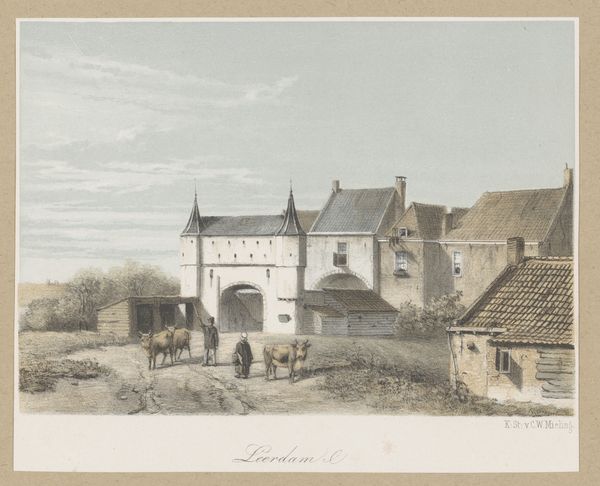 Curator: This etching, "De plompetoren aan het Singel in Utrecht", dating from between 1809 and 1843, is the work of Cornelis van Hardenbergh. It resides here in the Rijksmuseum. Editor: My goodness, that title just rolls off the tongue! But really, what a delightfully moody piece. I get a touch of melancholy from it. It looks as though it was a cloudy day. Curator: Note how the artist utilized etching techniques to achieve this romantic style. The density of line work and controlled applications creates varied tones. He’s recorded not just the architecture but its physical situation; it shows human use in all aspects of construction materials, use of watercraft. Editor: Right? It's almost tactile. You can practically feel the dampness of the stone. Did people really used to spend their afternoons near large, stony buildings? It reminds me of a book cover somehow. Curator: Romanticism often depicted urban and natural scenes and a specific fascination with architectural decay. Look closer and you see how social structures were shaped by landscapes and urban environments during that period. People interacting near old stonework-- that’s work and leisure intertwined. Editor: Mmm, I like your thinking, you can smell the production, the making... For me, that atmospheric quality overshadows a purely documentary reading. There's something almost dreamlike. I get a real sense of personal feeling emanating from this artwork, which invites contemplation. It also provides an unusual view of a regular old day back when! Curator: Ultimately, whether we look at process or feeling, Hardenbergh offers us a layered snapshot of urban life that acknowledges that labor and landscape mutually inform our perspectives. Editor: Exactly! Perhaps that melancholic feeling that touched me earlier now seems a touch more profound and a little bit more lived-in, and isn’t that really what all artworks should make us do in the end?