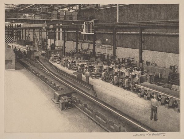 Charles Reed Gardner made this etching, "Paper Making," sometime in the mid-twentieth century. The lines are so deliberate and meticulous, it’s almost like he’s building the scene before our eyes. Look at the way he renders the light filtering through the window, each stroke carefully placed to create depth and shadow. You can almost feel the texture of the machinery and the smoothness of the paper, can’t you? Gardner doesn't conceal the means of production, but lays bare the physical act of making, in art and industry. The rhythmic lines evoke a sense of movement and labor, mirroring the repetitive motions of the papermaking process. It's a dance between the artist's hand and the industrial world. Gardner reminds me of the precision and dedication of someone like Joseph Pennell, who captured the spirit of industry with a similar blend of realism and artistry. Ultimately, Gardner invites us to see the beauty in the ordinary, and to appreciate the labor and craftsmanship that goes into creating the materials we often take for granted.