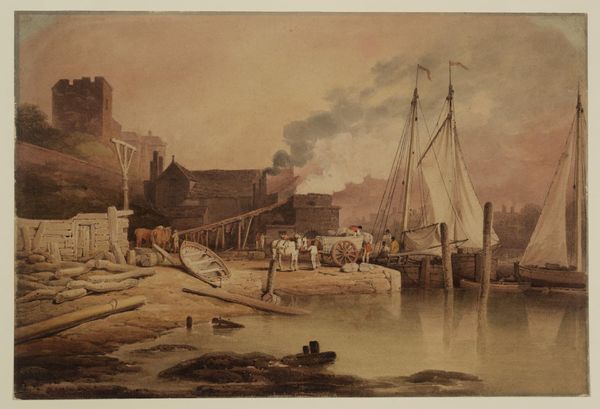 Editor: This is John Gendall's "Dover Harbor," from around 1820, and rendered in ink, watercolor, and gouache. It's such a detailed scene, and the muted palette creates a calm, almost dreamlike, atmosphere. What do you see in this piece? Curator: I see a layering of symbols deeply embedded in the cultural memory of England. Water, in Romanticism, is often about the sublime, about journeys and the unknown. A port city like Dover intensifies that symbolism. Note the contrast between the calm water and the bustling figures on the shore. It’s not just a snapshot; it’s a carefully constructed visual argument about England’s relationship to the world. Editor: Visual argument? How so? Curator: Consider Dover's historical role as a point of departure and entry. Each figure contributes. Are they merchants, travelers, or perhaps even soldiers? Their gestures and interactions tell stories of trade, exploration, and potential conflict. Notice the fortress high above the harbor—a potent reminder of national security. These elements speak to England's complex identity: a nation of commerce, adventure, and guarded borders. Does the landscape invite or warn? Editor: I never thought about it like that, I was drawn in by the colors, but you’re right, there’s a story being told within that harbor itself! Thanks for opening my eyes! Curator: And thank you for the reminder that art can connect us both visually and conceptually, spanning centuries through enduring symbols.