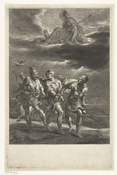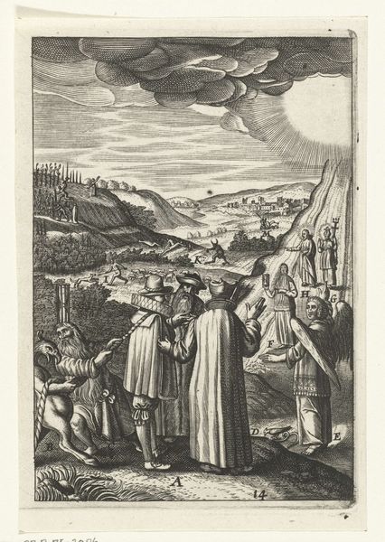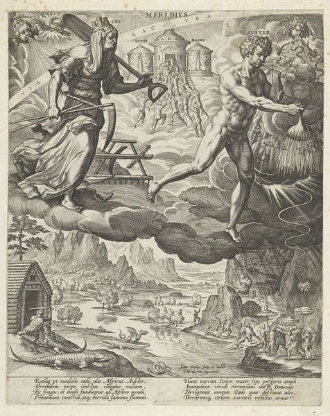 Curator: This title page for "La dioptrique oculaire" by Chérubin d'Orléans, printed in Paris in 1671, certainly presents a striking image. The engraving, created by Gérard Edelinck, is rich with detail and invites a lot of different interpretations. Editor: My first impression is one of grand allegory. It’s a fascinating combination of classical and divine elements—the soaring angels, the figures in classical garb—it’s meant to impress, isn't it? Curator: Absolutely. Baroque imagery was often deployed for maximum impact, linking contemporary intellectual pursuits with a grand narrative. What interests me most is the symbolic weight of sight being explored at that particular time. What do you read in those telescope images, considering the political climate? Editor: It appears they literally envision using telescopic innovation as enlightenment, extending it to diverse peoples: notice the figures on the left representing military power juxtaposed with robed wise men on the right. It's communicating something about vision bridging different cultures and perhaps political viewpoints. And look at that strong verticality emphasized by that centrally located telescope. It unifies heaven, represented by the angels, and the Earth in the bottom register! Curator: Yes, notice how that vertical emphasis plays into older visual tropes associating linear direction with enlightenment, very baroque in its overt messaging. Consider that optical science itself was developing alongside powerful lenses of the church and state during the period; sight became tied to seeing clearly what one *should* see according to political directives. Editor: So you're saying that scientific advancement here is deployed as propaganda through art. If you didn’t understand the scientific nuances, the imagery itself conveys that seeing with this invention reveals some higher truth. Curator: Precisely. It also serves to cement Chérubin d'Orléans’ place within that intellectual lineage by placing his optical work within that symbolic frame. It also tells us something about the patrons and audiences who engaged with scientific works during this time. Editor: It really makes you think about how intertwined science, politics, and art were during the era. Thank you. Curator: My pleasure. I hope that this image sparks curiosity among the viewers about that crucial turning point when scientific seeing merged with ideological visual regimes.