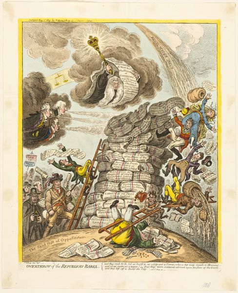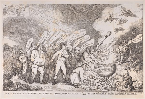 Curator: Good afternoon. We are looking at "The T Trade in Hot Water," an etching that some attribute to George Cruikshank, possibly around 1818. It resides here at the Art Institute of Chicago. Editor: It's chaos, pure chaos! My immediate impression is of an exploding teapot, brimming with figures and text, a real pandemonium depicted on paper. Curator: Precisely. The composition revolves around the central image of a teapot labeled "Steam Engine," connected by a spout to a giant teacup where frantic figures are being deposited. This links directly to the political and economic turmoil surrounding the tea trade in London. Editor: I see that now. The London Tea House stands behind plumes of smoke while individuals escape from the teacup into the path, strewn with balance sheets. What about the details, I see script covering much of the open space within the exploding teapot. Curator: Those frantic lines within the "steam engine" represent arguments and pamphlets related to the tea trade dispute of that period. Observe how this confluence of social, economic, and artistic elements illustrates Romanticism's inclination toward dynamism and individualism through form. Editor: It is remarkable how the etching captures a particular moment of contention. I wonder how audiences perceived the social commentary when Londoners were navigating the debate over adulterated tea and corrupt traders. Curator: Yes, consider also the interplay of textures. Look at the crisp, precise lines describing the figures, compared with the swirling, almost uncontrolled lines representing smoke. These lines emphasize themes within British culture and how to read these social commentaries that become available through their interplay. Editor: True, this textural interplay serves as more than decorative technique. I find that the juxtaposition heightens the overall sense of societal instability. The romantic flourish with sharp, crisp strokes adds dynamism within its commentary on cultural norms. Curator: I agree entirely, by emphasizing conflict and visual contrast, Cruikshank transforms "The T Trade in Hot Water" into a profound commentary on trade imbalances. Editor: After all is said and done, its enduring power is in revealing cultural unease and anxieties from past eras that reverberate today through visual dynamics.