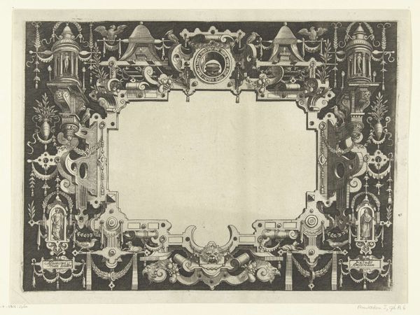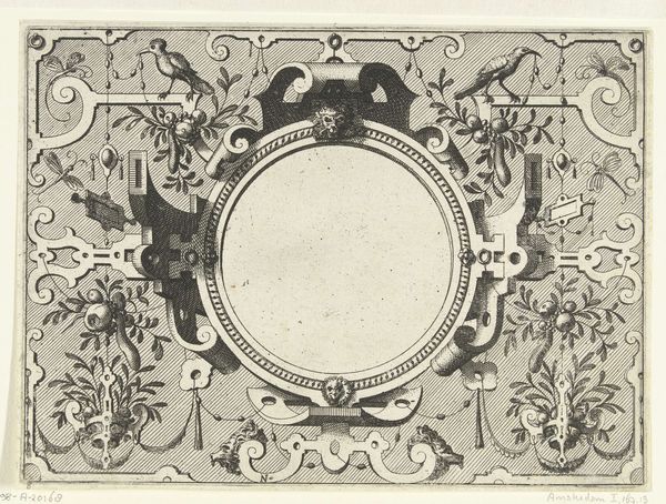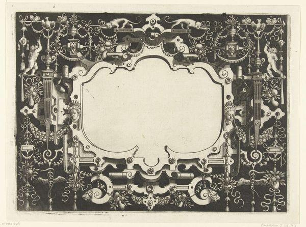 Nicolaes de Bruyn created this rectangular cartouche engraving with a peacock in both upper corners. The composition is dominated by a stark contrast between the ornate black background and the crisp white rectangle at its center, immediately drawing the eye. De Bruyn masterfully plays with baroque elements, densely packing scrolls, masks, and symbolic creatures into a tight frame. Note how the symmetrical arrangement creates a visual rhythm, yet the intricate details defy any sense of monotony. This dense ornamentation echoes the cultural fascination with symbolism, inviting us to decode the meaning embedded within each carefully rendered motif. What do these recurring images of animals and grotesque masks tell us about the values and anxieties of the time? Consider how the stark contrast and layered depth not only please the eye but also stimulate intellectual engagement, turning a decorative piece into a complex semiotic puzzle. This cartouche is not just a frame but a discourse.