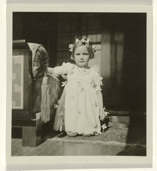 This is a photograph of Princess Beatrix, taken by Anefo shortly after her return to the Netherlands; it is a small gelatin silver print. The image is composed of subtle gradations of grey, capturing a moment in time. You can almost feel the sunlight on her face. Looking closely at the surface, you can see the slight imperfections and texture of the photographic paper. The details are sharp in the foreground, where the princess stands, and softer in the background where a crowd is gathered. This helps to focus the viewer's attention. The way the light catches her hair and the gentle curve of her cheek creates a sense of intimacy. The way the composition brings together the portrait and a landscape makes me think of Rineke Dijkstra, she has a similar touch in her own approach to portraiture. It's a simple photograph but it captures something essential about this young person.