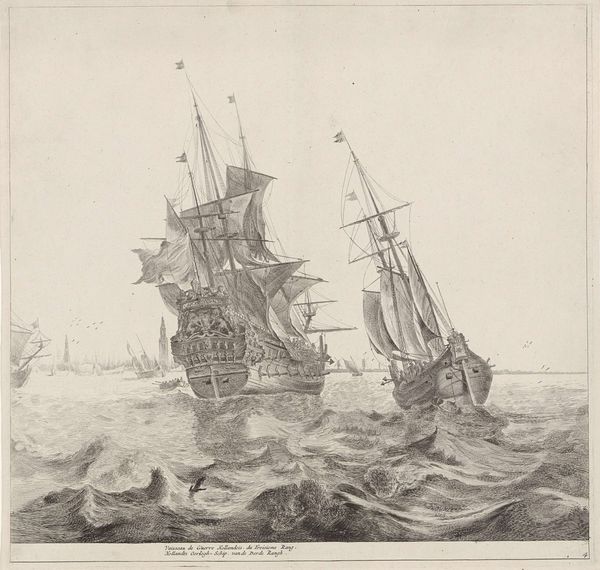 Frederik Ottens created this engraving titled "Gezicht op het IJ met roeiboot", or View of the IJ with a Rowboat, in the 18th century. The composition is dominated by a large sailing ship, which is placed off-center, creating an asymmetrical balance with the smaller boats in the foreground. The use of line in this engraving is particularly striking. Ottens employs a dense network of fine lines to depict the texture of the water, the billowing sails, and the intricate details of the ships. These lines create a sense of movement and vitality, capturing the dynamic energy of the maritime scene. The varying densities of the lines also contribute to the tonal range of the image, creating contrast between light and shadow. The perspective is subtly managed, giving us a sense of depth that draws the eye towards the horizon. Through these formal elements, Ottens presents not just a depiction, but also a commentary on the maritime power and artistic skill of the Dutch Golden Age. The engraving invites us to reflect on how the interplay of line, composition, and perspective shapes our understanding.