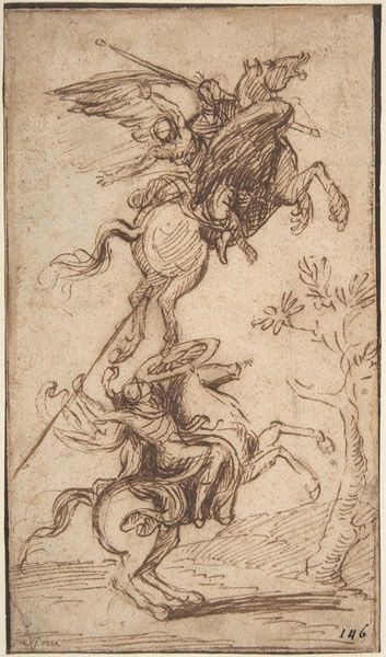 Curator: Here we have Giovanni Battista Foggini's "Design for the Base of a Vessel with Two Satyrs," dating from about 1652 to 1725. It's rendered in ink and charcoal on paper, and what immediately strikes me is the dynamic tension captured within these simple lines. Editor: The first thing that leaps out at me is how unresolved it feels, yet completely self-contained. The monochrome adds a certain severity, highlighting the muscular definition of these figures, but then their postures suggest strain... are they burdened? Curator: Exactly! Consider the satyr motif – primal beings connected with Dionysus, revelry, and instinct. To depict them supporting, literally bearing weight, presents an intriguing juxtaposition of raw freedom with enforced constraint. Doesn’t it call to mind a wider cultural understanding of suppressing innate urges? Editor: Perhaps. However, let’s not overlook the sheer artistic skill in portraying such muscular figures with so few lines. See how the artist suggests volume through subtle gradations of tone and weight in the ink washes? The chiaroscuro creates an incredible sense of depth despite the flatness of the page. This work emphasizes a certain anatomical idealism. Curator: Indeed. The bodies almost twist unnaturally, but that very torsion underscores the struggle – the satyrs aren't just *holding* something up; they're contending with immense pressure. We read that bodily struggle and relate to the universal burden of our base instincts, forever having to restrain who we are versus who we are meant to be. The artist deftly portrays both. Editor: Ultimately, the function of the image, being a design for a vessel base, complicates these interpretations. Were it realized in three dimensions, how might its symbolism shift? That this remains a two-dimensional sketch makes us consider these forms as purely aesthetic constructions of Baroque design. Curator: Yes, the functionality invites another layer of meaning! A vessel—something that contains, holds, often liquid…perhaps hints at how those instincts may fuel artistic endeavors, literally supporting their creations. I see how one perspective unlocks a richer interpretation upon closer examination! Editor: A perfect synthesis of symbolic interpretation and visual execution, yielding unexpected insight.
