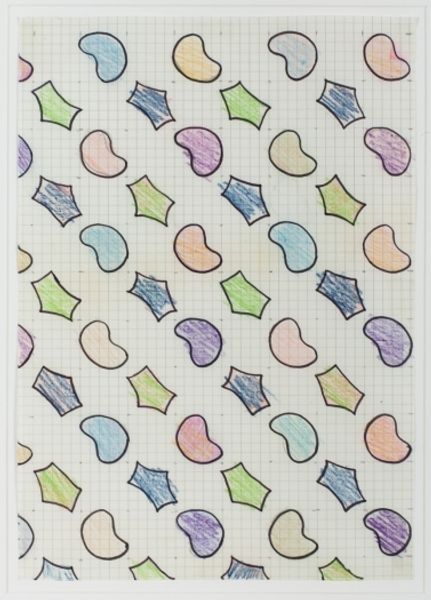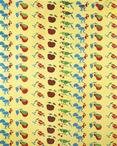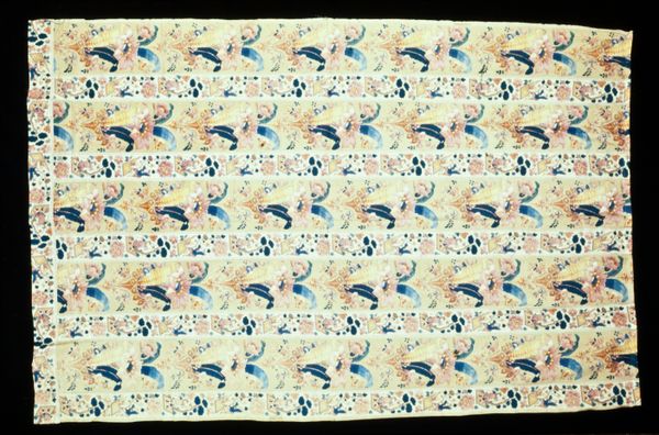 Curator: This intriguing work, simply titled "Untitled," comes to us from Konrad Lueg in 1965. It's a mixed-media piece, primarily incorporating textile and paper. What catches your eye about it? Editor: Immediately, the repetition strikes me. It’s playful but insistent, a field of echoing forms, almost hypnotic in its regularity. What are these shapes though? Curator: The shapes could certainly be read as hearts or perhaps leaves, arranged in a regular, almost wallpaper-like design. Looking at this, it recalls earlier traditions in decorative arts. Editor: That tension between "high art" and mass production interests me, particularly given the era. This feels like a conscious nod toward Pop Art, wouldn't you agree? This piece of printed material is quite appealing. Curator: Definitely. The adoption of textile patterns nods towards Pop Art. In Pop Art, patterns possess that ability to transform any space into one brimming with contemporary life and that frenetic commercial style so relevant at the time. What does such a symbolic gesture communicate, or reinforce? Editor: To me, it's speaking to the pervasive visual culture of the mid-20th century. Everyday motifs like hearts, often laden with sentiment, become flattened, reproduced endlessly like any other commodity. It almost deconstructs the very idea of romance. Curator: An interesting point. Though repeated, the slight variations in colour – greens, oranges, yellows, grays– suggest a handcrafted quality, despite its mechanical reproduction. In this case, that’s an act of subversion by the artist that attempts to counter that flatness. It presents humanity over industry. Editor: I think that subversion is key. By presenting a repetitive design, but not a perfect repetition, he holds two opposing things in visual balance: cultural criticism and, potentially, nostalgia. Curator: Exactly. Thinking about this design's repeated patterns really lets us understand its impact on how our society communicates meaning and what Lueg did to it. Editor: Ultimately, Lueg has presented us with more than just an exercise in design; it's a reflection of us. It also highlights the beauty of finding artful resistance and finding freedom in what society can often label as oppressive through norms.