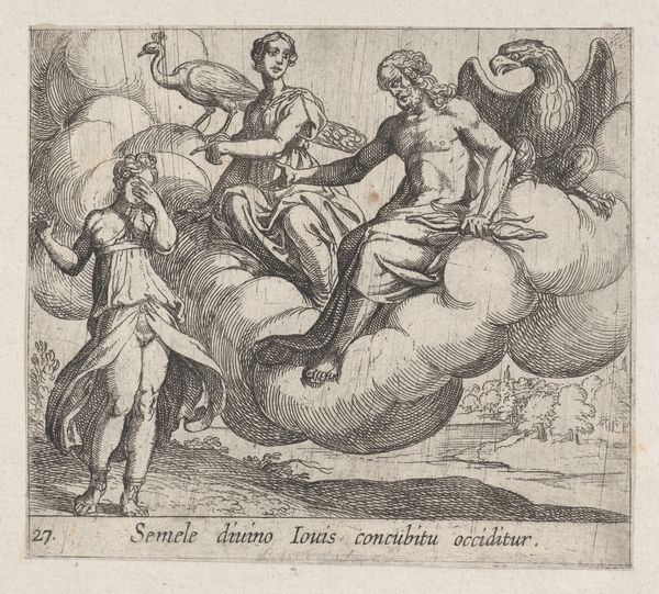 Curator: Here we have Antonio Tempesta’s "Semele's Wish," a flurry of fine lines depicting a rather unfortunate moment. My first thought? Drama! Pure operatic drama, etched in miniature. Editor: Yes, it’s all about the density of the engraved line, isn't it? Look at how Tempesta uses cross-hatching to build up the shadows in those cloud forms. It speaks to the labor involved, the sheer hours spent manipulating the copper plate. Curator: And the story! Semele, a mortal, dared to ask Zeus to reveal his true godly form. The result? Instant incineration. Talk about a cautionary tale. Editor: Incineration indeed. And etched with such meticulous detail. The consumption, of course, isn't just Semele's body but also the resources—the copper, the ink—to create this image. Curator: It’s a potent reminder that even beauty can have a fiery price. Editor: Precisely. A confluence of material and myth, etched for eternity.