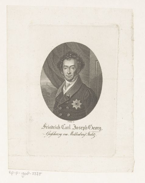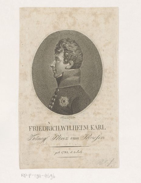 Editor: So, here we have a portrait, "Portret van Carl Philipp von Wrede," made sometime between 1796 and 1855 by Christian Ermer. It's an engraving, which gives it this crisp, almost severe feel. It's definitely a formal piece... But beyond that, I'm a little stuck. What strikes you about this work? Curator: Oh, it whispers stories, doesn't it? The crispness you mention is the cool reserve of neoclassicism, the art of reason and order bubbling up after revolution. This chap, von Wrede, he seems determined to present himself as unshakably solid, but the engraver's burin captures a hint of vulnerability around his eyes, don't you think? As if the weight of his titles – *Königlich Bayerischer Feldmarschall und Kriegs-Minister*, quite a mouthful! – presses down on him just a bit. He's literally wearing his status, but how does it *feel*? Does that make sense? Editor: I see what you mean about the eyes, now that you mention it! It's like, he's playing a role, but we glimpse the person underneath for a split second. Is that why he's framed in the oval, sort of separated from the world? Curator: Precisely! That oval is both enshrining and isolating. A Roman emperor on a coin. He's both present and abstracted, real and idealized. Ermer wasn’t just depicting a face; he was etching an idea of power onto paper. Tell me, does knowing all that change the way *you* see him? Editor: Absolutely! I went from thinking "stuffy portrait" to seeing a real person wrestling with the image they need to project. Wow, it is amazing all of the context that one image contains. Curator: Isn't it just brilliant when a portrait, seemingly fixed in time, can still spark a lively debate with us centuries later?