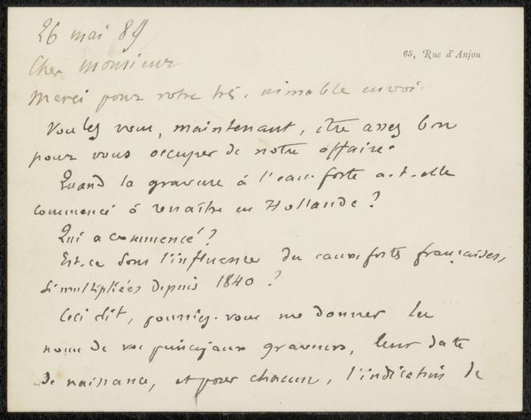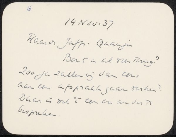 Editor: Here we have Selma Boasson’s “Brief aan Philip Zilcken,” possibly from 1923. It’s a drawing done with pen and ink on paper. The handwriting feels almost like a textile pattern. What jumps out at you about this piece? Curator: For me, it’s the materiality of the letter itself. The ink, the paper, the very act of handwriting – these were the means of communication before mass digital media. Consider the labour invested: the time taken to formulate thoughts, the physical effort of writing. Each stroke represents a conscious decision. Editor: That’s a good point, I didn’t consider the time factor! Curator: Think about the social context too. This letter wasn’t dashed off in an email; it required deliberate action – writing, perhaps a trip to a postbox. These physical limitations shaped the nature of communication itself, creating value, so would this be ‘art’ now if it had been digitally printed, or emailed, or simply erased? It's intriguing how this everyday artifact becomes something precious. It’s also nice to know the typeface would be custom. It's completely impractical from a print-making perspective. It suggests this note comes with an intention only to communicate and with no consideration about distribution, value, market, sales, which takes on an additional 'materialist' perspective. Editor: So, the letter's value resides not just in its content, but in the materials and labor that went into making it? Curator: Exactly! The hand-drawn quality contrasts with the clean, printed text we’re used to seeing, inviting us to consider how the means of production shapes our perception. In effect it resists the industrial reproduction standards! Editor: I guess I never really thought about how the choice of materials can be such an integral part of an artwork’s message. Thanks! Curator: It's about understanding that the “how” is just as important as the "what”. The creation and the intent, the hand versus the machine and understanding how and why certain paths are chosen. That the artist has elected to write with their own hand suggests the meaning is contained not only in the words themselves but the craft of communication!