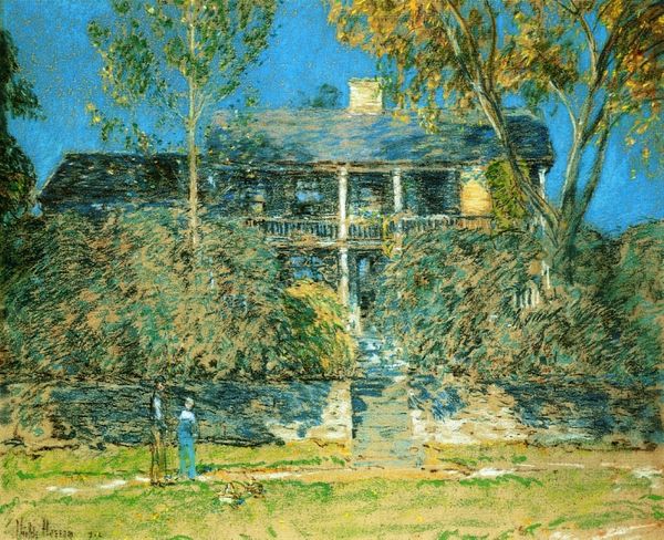 Curator: “My House” painted in 1929 by Eliseu Visconti. It's an oil painting done en plein air, a charming landscape in the Post-Impressionist style. Editor: It's dreamlike, isn’t it? A bit faded, like a beloved memory clinging to the edges of awareness. Curator: Exactly! The composition, almost a genre scene, evokes a certain intimacy. The placement of the house, nestled amidst the natural elements, does frame it as the center of daily existence. Editor: You feel invited in, even with the haze. See the washing line, the family grouped outside. There is some evidence of social activity depicted there in plain sight. Visconti is asking, isn't it: "what are the conditions that allow humans to create meaning in everyday spaces?" Curator: It makes me think of the role domesticity has played, or should have played in that historical period and it goes against the ideal depictions promoted. Editor: Yet, the Impressionistic technique, those brushstrokes, the choice of colour; everything gives the landscape a nostalgic hue! Does it speak to Visconti's sense of home, of belonging, or perhaps, even of something he was losing at the time? Curator: Interesting reflection on your part. Perhaps he was longing for a more ideal version of the reality he was witnessing. Editor: And I think he does this in such a universal way; that small window with the laundry hanging could be anyone's window, the place could be somewhere near or far, we relate to what is known but obscure about it at the same time. Curator: I feel so connected to those intimate daily acts that, despite their mundanity, still connect me to our shared humanity. The work itself suggests there is still meaning to be made within those little gestures. Editor: Agreed! It's like he’s whispering: treasure the everyday. Curator: Ultimately, a testament to how much beauty exists if we pause to really witness it!