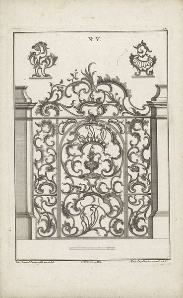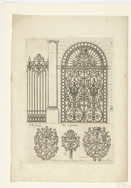 This print depicts a gate with a variation for the right half, by an anonymous artist. Although we don't know the maker's name, the image speaks volumes about the artistry of metalwork. Observe the intricate details: the vertical bars, the finials, and the decorative flourishes. The gate is not just a barrier; it's a statement of wealth and status. The metal worker would have employed techniques like forging, casting, and welding, transforming raw materials into refined forms. The iron's strength offers security, while its malleability allows for ornamentation. The design reflects the social hierarchy of the time. The gate serves as a threshold, delineating public and private space, and emphasizing exclusivity. Consider the labor involved in its creation. Skilled artisans dedicated hours to shaping each element, contributing to a final product that embodies both function and artistry. This image prompts us to rethink traditional notions of art, recognizing the cultural and social significance embedded in everyday objects.