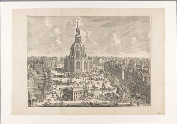 Editor: Samuel Prout's "Cathedral at Mayence," created in 1833, is a lithograph depicting a bustling cityscape dominated by the imposing cathedral. I'm immediately struck by the contrast between the grand, almost austere architecture and the lively market scene unfolding below. What social dynamics might Prout be trying to capture here? Curator: It's crucial to understand the socio-political context of 1830s Europe. This print doesn't simply depict a cathedral; it visualizes power structures. The towering cathedral, rendered in precise detail, signifies not only religious authority but also the deeply ingrained patriarchal structures of the time. Note how it overshadows the figures in the marketplace. What could that placement suggest? Editor: Maybe it implies the Church's influence on everyday life? Even mundane activities like trade occur under its gaze. Curator: Precisely. Furthermore, consider the "cityscape" theme itself. Urban environments were, and are, sites of social negotiation, where class, gender, and religious differences played out daily. Who do you think had access to the power that cathedral embodies, and who was likely excluded from it? Editor: The merchants in the foreground, presumably, had some power. But probably not the women. They are only there to support the activities, not as equals. And perhaps the artist is placing himself on a different standing as the people portrayed? Curator: Indeed. Prout, as a travelling artist, likely occupied a liminal space, observing and interpreting the social dynamics of Mainz. How might his own identity – his gender, class, and nationality – have shaped his perspective and, consequently, his depiction of this scene? What purpose may this depiction serve in England? Editor: That's a lot to think about. I hadn't considered the artist's own positionality in interpreting the scene. It makes you wonder what he thought of what he saw, of their everyday life. Curator: Exactly. By situating the artwork within these broader historical and social frameworks, we move beyond mere aesthetic appreciation and begin to critically examine the power dynamics embedded within it. I learned that we are limited in our vision based on our time and standings. What did you learn?