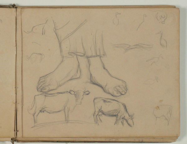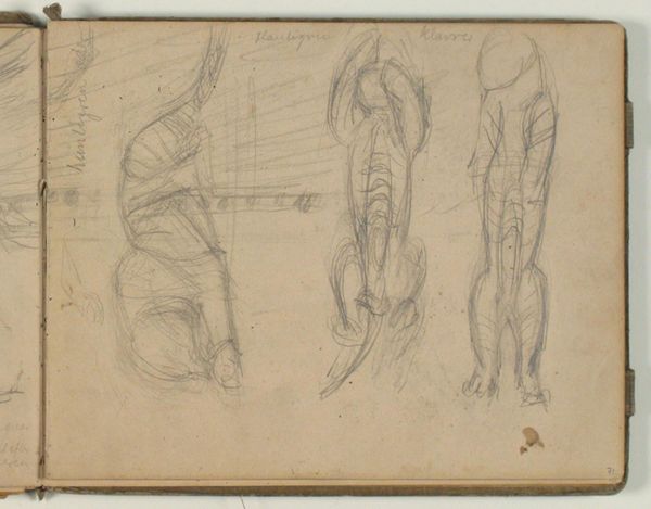 Editor: This is a page of sketches by Niels Larsen Stevns, entitled "Skitser af tiger og kapitæl", dating from around 1900-1905. It's rendered in pencil, and the quick, light strokes give it a sense of immediacy, like capturing fleeting impressions. I'm especially intrigued by the juxtaposition of the tiger sketches with the architectural element; it seems an odd combination at first glance. What do you make of it? Curator: An odd combination perhaps, but one ripe with symbolic potential! Consider the tiger: for millennia it has embodied strength, ferocity, even royalty across various cultures. These are not simply animal studies; they tap into a well of cultural associations, of power and the sublime. Then consider the capital; a vestige of classical architecture, suggestive of order, civilization, and enduring structures. Editor: So you’re saying it's more than just the artist practicing? Curator: Precisely. Juxtaposing these images invites a dialogue. Think of the enduring presence of both animal motifs and architectural forms throughout history, from ancient frescoes to modern advertising. Stevns, consciously or unconsciously, seems to be exploring the continuity of powerful symbols across different realms. Does the architectural detail remind you of any particular tradition or cultural context? Editor: I see it a bit differently now. The tiger embodies wild, untamed nature, and the capital stands for human structure, creating tension. Maybe it's about the taming or containing of raw power? Curator: An astute observation! Consider that "taming" not only in a literal sense but also psychologically; how societies, and even individuals, channel and control their own 'tigerish' impulses. Art itself becomes a way of processing, representing, and ultimately managing such primal energies. Editor: That gives me a lot to think about - seeing these sketches not just as studies, but as a visual representation of cultural and psychological forces. Curator: Indeed. It’s a fascinating glimpse into how visual symbols maintain relevance and resonance across time, echoing in our collective memory.