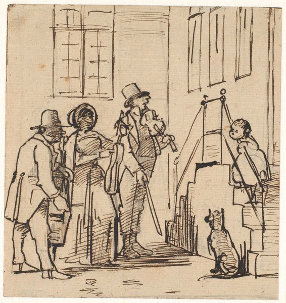 This ink drawing, known as "Gadescene," captures a street scene with an anonymous hand and eye. Its stark black lines sketch out figures and architecture, setting a stage that feels both immediate and distant. The composition, with its clear foreground and hinted background, uses line work to define depth. Hatching creates shadows, giving shape to the characters and buildings. The artist’s hand is evident in the variations of line thickness, which inject a sense of movement into the static scene. The work suggests a commentary on social interactions, capturing a fleeting moment. What is being said between the figures, and their relation to the architecture behind them? This remains elusive, suggesting that the scene’s meaning resides not in explicit narrative but in the formal interplay of line, space, and suggestion. Ultimately, the drawing invites us to look closely at how simple means can evoke complex social dynamics. The absence of explicit detail becomes a space for our own interpretation.