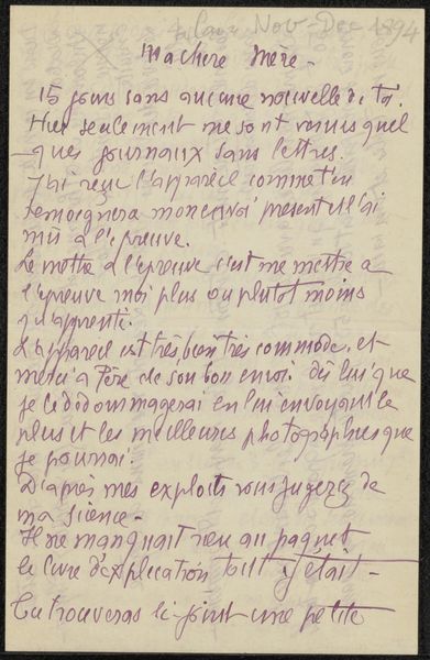 Curator: We're looking at “Brief aan Andries Bonger,” a letter composed before 1895 by Émile Bernard. This delicate drawing incorporates ink on paper, preserving a piece of art history through photography. It's fascinating to witness the raw interaction between an artist and his materials in a pre-digital age. Editor: Yes, and even beyond that – look at this writing. It almost appears as an abstraction, a coded world to get lost in. So intense and personal. It reads like a diary entry. You sense intimacy, loneliness, artistic struggles, right? Curator: Absolutely, the handwritten nature emphasizes a certain type of physical production. Before mass printing, written communication possessed a distinct material value. Each word meticulously rendered by hand creates layers of social meaning about labor, literacy, and class that shaped the relationship between writer and receiver. Editor: I completely see what you’re saying but the personal is just jumping out here, you know? You feel the pressure on this person; the urgency and hope behind their artistic mission...It feels as if he's directly communicating a state of being to us, not just a dry report. Curator: Perhaps, but think about the paper itself. Where was it made? By whom? Who would be able to access something like that? Paper in the pre-digital world involved entire social, economic, and industrial systems that enabled people to send and record history, including letters like this. We can't abstract this. Editor: Fine! I won’t then! It's amazing to realize all that human labor comes down to the final product. The act of transferring a deeply personal thought onto material reality has been captured. Curator: Agreed. Seeing the evidence of craft underscores not only our role as interpreters of intent, but also as material witnesses. It shifts our gaze beyond just aesthetics toward acknowledging labor, tools, and production in culture-making processes that remain obscured from mainstream interpretations of art history today. Editor: So, while our connection starts at emotional immediacy, now we see this sketch carries with it the story of a particular time. An economy behind simple sharing, like here, in an old correspondence, or even a humble notebook... Amazing.