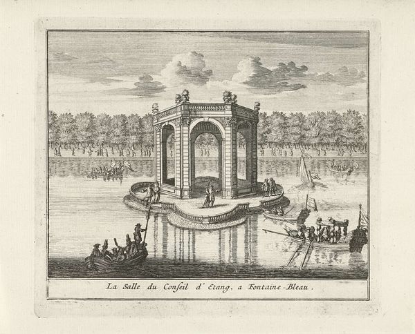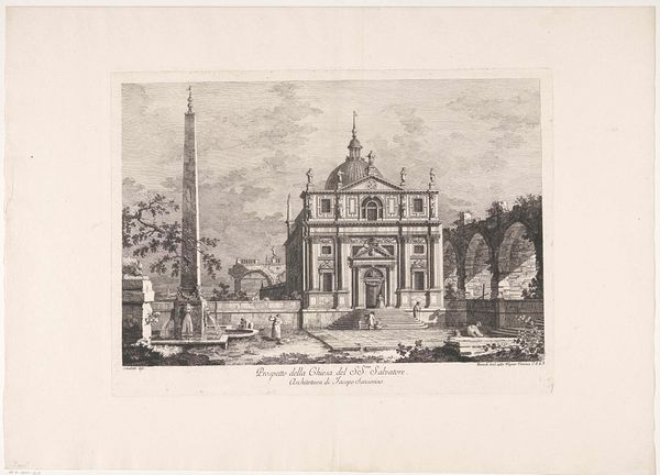 Editor: This engraving, “Gezicht op de Fontana Paola te Rome,” made sometime between 1685 and 1711, captures a stunning cityscape by Jan Lamsvelt. I find the architecture fascinating—its perfect symmetry almost intimidating. What catches your eye most when you look at this piece? Curator: The interplay of light and shadow, for one. Lamsvelt is a master of illusion. Notice how the crisp lines of the architecture are softened by the feathery clouds. It reminds me of a stage set, doesn't it? A grand display of power and artistry. And, personally, I feel the engraving breathes. Can you see that too, despite it only being black and white? Editor: I think I see what you mean; it's quite dynamic, actually! Curator: The baroque loved that sense of drama. It’s more than just showing a building; it's celebrating Rome, the papacy, the very idea of ordered beauty rising from a somewhat rugged landscape. And the tiny figures milling about—they emphasize the scale, yes, but also invite us into this carefully constructed world. Do you feel invited? Editor: I do. Initially, I thought the precision made it unapproachable. But with the people, it feels more human. Almost like an invitation through time... Curator: Precisely! It’s a captured moment. Each line meticulously placed. Think of it as Lamsvelt handing you a key to unlocking 17th-century Rome, one of faith, ambition, and incredible artistry. Now, having thought this through together, does this work trigger thoughts of modernity or an old, somewhat unreachable dream? Editor: That’s a tough one! Perhaps it is somewhere in the middle, a perfect mix of the past, present and future, intertwined into one vision that now we have made our own. Curator: Yes, well said! Sometimes the best views offer both distance and connection.