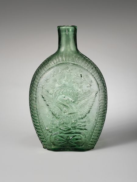 Editor: Here we have a charming emerald-green glass flask, created by the Coventry Glass Works around 1824. It's decorated with what appears to be a molded basket of fruit. It feels somehow both rustic and refined at the same time. What stands out to you about it? Curator: Well, beyond its visual appeal, this "Figured Flask" is a fascinating artifact for understanding the social and cultural landscape of the early 19th century. How do we reconcile the apparent “rusticity” with the clear nod to Neoclassical forms and imagery? Editor: Good question! The basket and fruit design feels...homey. But the shape is classical. Curator: Precisely! Flasks like these were increasingly available due to advancements in glass production. So, while Neoclassicism was popular among elites who wanted to link themselves to ancient ideals, the rise of factories made decorative items like this available to a growing middle class. It suggests the spread of those ideals downwards. Editor: So it's about accessibility and aspirations? Curator: Absolutely. Think about how decorative arts entered American homes – were they merely aesthetic additions or silent signifiers of a desired social standing? Was this flask possibly a symbolic stand-in for something grander? What's *in* the flask matters too, and who sees you taking a swig. These are items meant to be seen in public. Editor: That's really interesting. I was just seeing it as pretty, but it says a lot more, doesn’t it? It’s democratizing classist visual cues. Curator: Indeed. And that makes this seemingly simple flask a potent vessel for understanding the public role of art in shaping social identities. The rise of industry didn’t just change economies but also mindsets and cultures. It’s a piece that quietly embodies significant shifts.