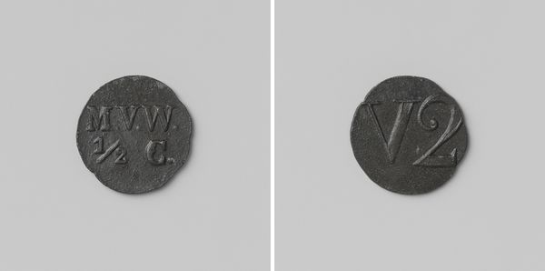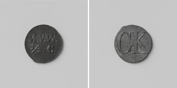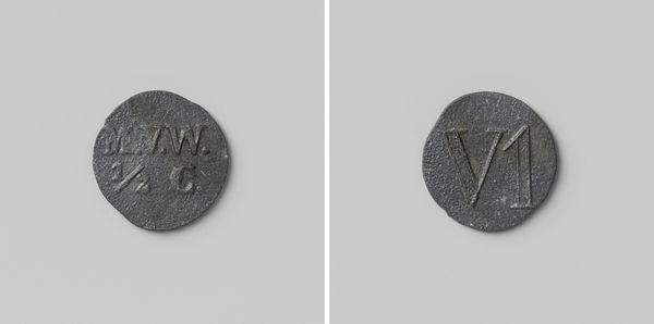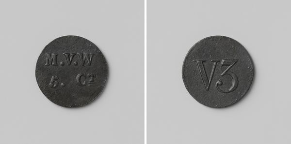 Editor: This object is a house coin, "Eerste gesticht van de strafkolonie Veenhuizen, huismunt geslagen op last van de Maatschappij van Weldadigheid ter waarde van vijf cent," made anonymously sometime between 1818 and 1859. Looking at its metallic relief, its muted color makes it look like a relic, but I'm unsure of its context. What story does this little coin tell? Curator: This coin speaks volumes about the intersection of philanthropy, social control, and early capitalism. The Society of Benevolence, the "Maatschappij van Weldadigheid," aimed to alleviate poverty but often employed methods that further marginalized the vulnerable. This five-cent token represents labor within a penal colony. Editor: A penal colony? Curator: Yes. Veenhuizen wasn't merely a place of refuge; it was a space of forced labor and social engineering. The coin, therefore, becomes a symbol of the inmates' coerced productivity, their bodies commodified. What does the act of creating a specific currency for this place do you think? Editor: It almost isolates them further, like creating a society within a society, controlling not just their labor, but their economy, too. It must have increased control of those who ran the institution. Is this meant to carry value, beyond the penal colony? Curator: Precisely! This currency, specific to Veenhuizen, reinforces a closed system, a controlled environment where inmates’ mobility and autonomy were severely restricted. It's a powerful object when you consider the carceral system. What are your thoughts on its social role and its inherent power dynamics? Editor: It's unsettling. It's an example of decorative art intertwined with a dark history of social control. A reminder that good intentions can sometimes pave the road to exploitation. It makes me reflect on who benefits from such systems and how easily power can be abused. Curator: Exactly! This object is not just a coin. It encourages us to think critically about power, philanthropy, and the systems we perpetuate, sometimes unknowingly.