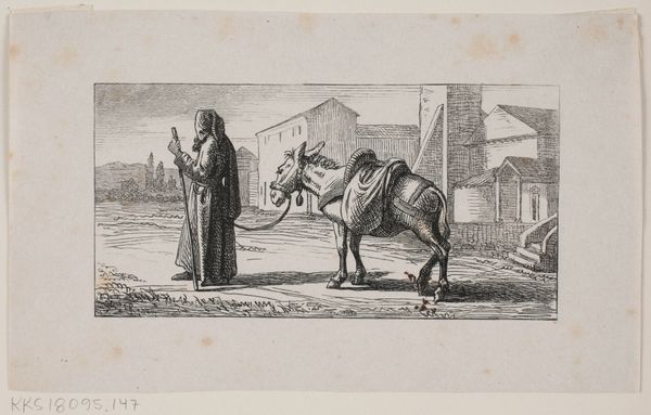 Curator: Alexandre-Gabriel Decamps's "Camel and Arabs," created around the mid-19th century, is a study in pencil, showcasing an Orientalist sensibility. The piece has an air of patient expectancy about it, doesn’t it? Editor: Absolutely. The subdued greyscale palette gives it a sort of historical, sepia-toned feel even though it’s just pencil on paper. It really sets a contemplative mood. Curator: It’s interesting to think about the artist’s hand and eye, isn’t it? The very specific choice to use graphite on paper. Not paint, not a grand canvas, but an accessible, almost documentary approach. What does that say about Decamps’ intentions in rendering this scene? The paper itself, probably industrially made even then, provided a neutral ground for him to recreate a "distant" land, imbuing the scene with a sense of realism while retaining its exotic allure. Editor: For me, the central figure is undoubtedly the camel, so elaborately adorned, and seemingly weighed down with equipment and possibly weapons. I keep thinking about the camel as this resilient, almost spiritual vessel in harsh environments, a long standing symbol of trade, endurance, and survival within Middle Eastern cultures. It’s not merely an animal, is it? It carries so much historical weight. Curator: Indeed, the accoutrements layered onto the camel are just as informative as the beast itself. The saddle, the rifle strapped to its back...these aren’t romantic additions but elements reflecting travel and perhaps military campaigns. The contrast of "Eastern" conveyance burdened by "Western" technology speaks volumes about colonial influence, suggesting that it might also offer an exploration into the era’s social and economic shifts. Editor: The lounging figures in the background also grab my attention; they don't appear particularly active or hurried. I get the feeling that these figures are not just placed to provide depth and atmosphere. Their relative repose subtly juxtaposes against the burdens the camel is designed to carry, almost giving you a sense of societal weight. Curator: The labor implied is critical. Decamps’ focus brings to the forefront the realities of transport and even possible conflicts during that period. And pencil drawing, usually seen as preparatory work for grander artistic ambitions, is transformed into an effective commentary itself here. Editor: In a world increasingly consumed by visual symbols, revisiting the imagery, like "Camel and Arabs", enables us to think about their lasting implications, perhaps even challenge assumptions about representation. Curator: Well said. Investigating the context behind artistic choices certainly gives one a deeper appreciation for even a simple medium like a pencil drawing.