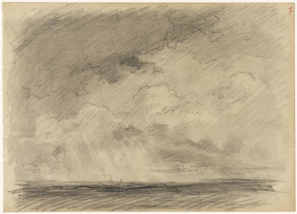 John Constable made this pencil drawing, Cloud Study at Hampstead Heath, on paper. The composition divides into two horizontal bands: earth and sky. Sparse details define the ground, while most of the sheet captures the sky’s atmospheric gradations. The artist wields graphite to render an array of cloud formations from dense and dark to light and diffused. Constable's formal study of meteorology reflects broader cultural shifts toward empirical observation and scientific classification. Yet, his artistic interest lies beyond mere replication. The drawing functions as a semiotic system where the sky becomes a field of signs. The clouds signify ephemerality and change. Each stroke represents a fleeting moment in the perpetual flux of nature. Consider how the artwork challenges the traditional landscape conventions by decentering the earth and elevating the sky. Constable invites us to contemplate nature not as static scenery but as a dynamic process. The drawing encapsulates a shift from nature as a backdrop to nature as an active force, continually reshaping our perceptions and interpretations of the world around us.
