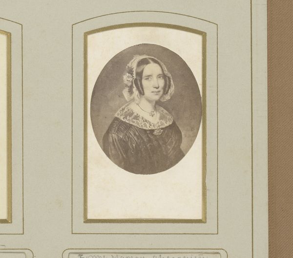 Curator: Here we have a photographic reproduction of a painted portrait, titled “Fotoreproductie van een geschilderd portret van een vrouw, aangeduid als oma Ghesquiere,” or “Photographic reproduction of a painted portrait of a woman, referred to as Grandma Ghesquiere.” It was made sometime between 1850 and 1892 by Charles D'Hoy. Editor: Gosh, she seems… serious. The way she stares out, almost like she knows the weight of generations rests on her shoulders. The soft, sepia tones kind of soften the blow, but those eyes are intense. Curator: Precisely. Consider the historical moment—photography offered new forms of representation, yet portraiture, traditionally the domain of the wealthy, sought to democratize access to image making. The gaze becomes a potent site for projecting power, lineage, and even anxieties about societal shifts. The lace bonnet and simple jewelry hint at a certain bourgeois respectability. Editor: But is it, though? To me, that bonnet seems almost like a fragile crown, doesn't it? And the dress, the way it catches the light, almost shimmering—I feel like there's this hidden story there, something that’s being played down. Curator: Indeed. The sitter’s self-presentation is a conscious performance, mediated by both the photographer and her own desires. One has to ask questions about who had access to even have such photographs taken and circulated at the time, or to have portraits painted to begin with. This then brings up the importance of portraiture to maintaining the visual language of social class, and the ways that such images were used to establish or destabilize social positions in broader cultural life. Editor: Grandma Ghesquiere probably had no idea her serious expression would trigger such thought centuries later! Looking at the overall sepia color is oddly soothing; it transports me back. Curator: Well, it is exactly this potential for contemporary engagement with such past portraits that underscores the crucial connection between photographic reproduction, art, social identities, and social contexts. Thank you for this lovely reflection. Editor: Thank you for lending me your expertise, this insight into Grandma Ghesquiere has been illuminating.