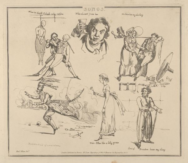 Curator: Welcome. Before us, we have "Personification of Victory, Two Fighting Men, Orpheus and the Head of a Man", a drawing by Firmin Gillot, potentially from 1864 to 1866. It’s rendered in ink on paper, blending figuration, narrative, and portrait styles. Editor: Oh, it’s chaotic! I mean that in the best way. Like a glimpse into someone's sketchbook when their mind is just overflowing. All these separate scenes crammed together—it's unsettling but also so vibrant. Curator: Absolutely. Notice how Gillot divides the sheet into distinct vignettes, yet connects them through thematic resonance and material continuity. The composition, while appearing scattered at first glance, uses the blank space as a compositional tool, allowing each drawing to breathe individually while still participating in a unified field. Editor: Right! It almost feels like peering into someone's dream journal. That winged figure on the left – Victory, I suppose – feels stiff compared to those men wrestling, so rough and tumble. And then there's Orpheus. He is such a stark contrast with the raw emotion. He is serenely posing near the beast while leaning against the bark of a tree, detached in his sorrow or singing. It's kind of breathtaking. Curator: Indeed. The "Personification of Victory" references classical ideals with precise lines that render a sense of stability; that offers a grounding influence against the dramatic energy depicted elsewhere on the sheet. And yes, regarding Orpheus, Gillot elegantly captures the musician’s melancholic state and the forest, creating a symbolic exploration of loss and its acceptance within the natural world. Editor: And the material too... the paper itself feels fragile, like holding a thought before it fades. You can practically smell the ink! Each line is so immediate, almost desperate in places, trying to catch something fleeting. Curator: Indeed, that haptic relationship makes each work distinct and contributes to an expressive aesthetic. Together with line thickness, varied texture and visual planes achieve dynamism across this single sheet, encouraging a dialogue between classicism and a looser, more personal form of expression. Editor: Thinking about this piece and how it was brought together, Gillot felt like he needed to lay all of it out on a table for us to sift through... What does it say to you in summary? Curator: This particular piece showcases the artist’s complex, fragmented view, and technical mastery. It makes it an exemplar piece from the period!