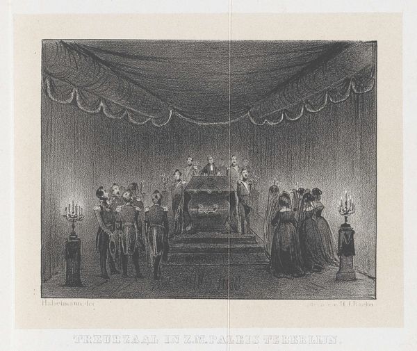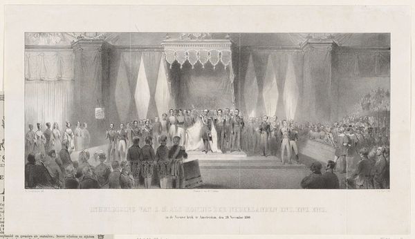 Curator: Look at this, it’s called "Inhuldiging van Willem Frederik, prins van Oranje als souverein vorst, 1814", an engraving created between 1814 and 1816, giving us a glimpse into a specific historical moment through the eyes of Abraham Vinkeles. Editor: First impression? It feels staged. Deliberately, almost aggressively so. All those draperies, the symmetrical figures, it screams "establishment". Curator: The artist captures the solemn atmosphere of the inauguration. It's a portrait of power, but done in the old engraving style that has this ghostly ethereal quality to it. Makes you wonder about the accessibility of art during this period—prints allowed for wider distribution, making these grand events relatable to more people. Editor: Exactly. Prints like this were instrumental in crafting the image of the new sovereign. The Neoclassical style reinforces the narrative of order and legitimacy. But look closer at the architecture and fabric. What kind of labor went into creating the physical spaces depicted here, to constructing these images? Curator: It's true; those details carry untold stories of production and the material world of the time. Thinking about those hidden contributions deepens the historical context so much. What feelings come to mind when considering that perspective? Editor: It creates this strange tension for me. The print romanticizes power, yes, but seeing the technique – the lines and hatch marks – reminds me of the artisans behind it, their hands shaping the visual representation of sovereignty. Almost subversive, isn't it? To think that this grand spectacle relied on the skill of countless laborers? Curator: In a way, it's beautiful – this delicate dance between what is shown and the process of how it was crafted; the layers add depth to what could've just remained a pretty historical snapshot. Editor: Ultimately, this engraving underscores how power relies on representation, carefully constructed from the materials and labor available, distributed to solidify a certain narrative. Curator: And I think it invites a deep breath to consider the multiple viewpoints history holds; perhaps one for those unseen workers, their hands echoing through the lines of this very print.