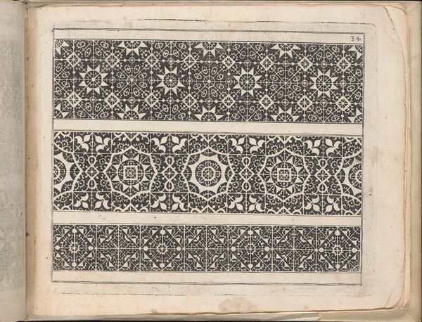 Curator: Looking at this engraving, it’s fascinating how crisp and ordered everything appears despite its intricate details. Editor: It has a strangely soothing effect, doesn’t it? Even though it is a reproduction from 1591, it is also contemporary in some way. Curator: Yes, its visual rhythms draw us in immediately. What we’re observing is folio 13 from Matteo Florimi’s "Fiori di Ricami Nuovamente Posti in Luce" at the Metropolitan Museum of Art. These are primarily graphic renditions demonstrating techniques for exquisite needle lace design and construction. Editor: “Fiori di Ricami” which translates to ‘embroidery flowers’ feels so indicative of Renaissance ideals in design that celebrated a connection to natural forms. The symmetry within asymmetry really appeals to me—two distinct rows separated by semi-circles form the central axis in an upper section, which is again echoed by two geometric bands with stellar shapes. Curator: The repetition, the controlled variations… these serve a practical purpose, though, rather than just a decorative one. Patterns were valuable commodities during the 16th century, easily shared and traded within communities where pattern books made needlecraft design accessible and widespread for all. Editor: Did these designs also have class connotations? I suppose the availability of instructional tools wouldn’t necessarily make it accessible for everybody to replicate patterns from that period. What purpose would lace have beyond signaling elite status, like refined garments to impress people in formal contexts? Curator: That’s exactly the nexus between artistry and social life that these patterns illuminate. Embroidery and lacework were important activities that spoke volumes regarding leisure, piety and cultural standing of their makers during that period. These were markers of a household’s economic sophistication. Editor: And in looking closer at this specific page, I admire how the anonymous artisan meticulously transformed negative spaces and lines, forming layers that both guide the hands in making patterns. Its sheer density draws us closer. I love its clarity of purpose, where functionality is the basis for artistry, while retaining a subtle element of beauty. Curator: I agree completely. Analyzing how something ostensibly functional can be beautiful in its very conception reveals essential information regarding Renaissance approaches to living artistically within cultural institutions. It forces viewers into interrogating form as the primary language here, transcending even context to elicit deeper responses. Editor: Indeed; thank you for expanding my own understanding with yours—these exchanges truly deepen our appreciation for works such as this.