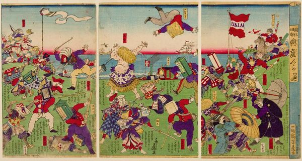 Editor: This is Utagawa Yoshifuji's "Comparison of the Destinies of the Enlightened and the Antiquated," a print on paper. It feels like a chaotic clash, but I'm curious about the story behind it. What do you see in this piece? Curator: This print is a powerful commentary on the clash between tradition and modernity in Meiji-era Japan. The "enlightened," brandishing western weaponry and under a flag that reads "EIKOKU" – England – are pitted against figures representing the antiquated. Editor: So, it's not just a battle scene, but a statement? Curator: Exactly. Consider who is winning, their dress, and how they fight. Yoshifuji uses satire to critique the wholesale adoption of Western ideals and the disruption of Japanese cultural identity. What does that suggest about the artist's own position? Editor: I guess he's questioning whether enlightenment always means progress. Thanks! Curator: Indeed. It invites us to critically examine the power dynamics inherent in cultural exchange.