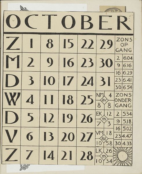 Curator: This is "Kalenderblad oktober 1900" (October Calendar 1900) by Theo Nieuwenhuis, a print combining typography and floral Art Nouveau design. It resides at the Rijksmuseum. Editor: It's beautiful! It's also interesting to see a calendar page as a work of art. The blend of ornate floral motifs with the practical grid of the dates is compelling, yet subtle. What can you tell me about it? Curator: This calendar isn't merely a decorative object, but also a commentary on industrialization at the turn of the century. Look at the way nature is stylized. Doesn't the regimented pattern mimic the increasingly structured and mechanized nature of early 20th-century life? Editor: So, the artist isn't just decorating, they are commenting on society? How so? Curator: Exactly. The Art Nouveau style, with its organic forms, was in itself a response to industrial design, reasserting the value of handcrafted, individual expression. Now, consider the function of a calendar. What does a calendar do? Editor: It organizes time. Schedules and deadlines! Curator: Precisely. By embedding this structured organization of time within this very handcrafted aesthetic, Nieuwenhuis perhaps poses questions around our relationship with time, labour, and the natural world amidst increasing industrialization. How do we reconcile these aspects? Editor: Wow, I never would have considered that. I just saw it as pretty! So, something functional like a calendar could speak volumes about labour and even resistance. Thank you for that, it's shifted how I view this and similar artworks. Curator: Absolutely. Thinking about an artwork’s broader socio-historical context illuminates what can be, initially, invisible. We've jointly explored how a calendar page isn't just a calendar, it is an encoded social narrative.