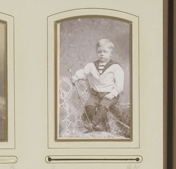 Curator: Here we have a photograph from around 1870 by A. Blavet, titled “Portrait of a Child, Standing by a Table with Books.” It's a charming example of portraiture from the late 19th century, showcasing academic art through still-life photography. Editor: It’s… curious. There's such a stillness, almost an anticipation of something unseen in that child's eyes. And those books! They add such weight to the scene, a world of potential and knowledge resting right there on the table. Curator: The books certainly weren't accidental. They were highly symbolic in this period, representing learning, social status and, importantly, the promise of upward mobility through education. Positioning the child next to them speaks volumes about societal aspirations. Editor: I'm fascinated by the child’s pose and dress too. It's as though he's playing a miniature adult, that checked pattern mimicking perhaps the garb of a respected figure of the time. What stories are we being told through such representation? Is this portrait about inheritance? Curator: Very possibly. Remember, portraiture was a powerful tool for projecting family legacy and virtue, and photography made that accessible to a broader segment of society. Consider the subtle messages—discipline, intellect, perhaps even patriotism if the pattern on the dress does point to a familial lineage. Editor: It is a powerful means of controlling how future generations might see their own lineage. Looking into this child's face now, across more than a century, the clothing feels like a message meant to survive across time. The setting with its aged aesthetic enhances a profound longing or cultural memory that such an image embodies. Curator: I agree; there's something haunting in the staging. Photography allowed for this capture of ephemeral moments, freezing not just faces but also the societal currents of an era for a later audience to unpack. It serves as a material testament to a specific ambition—a child ready to face his education. Editor: Thinking about the child and the books juxtaposed evokes the timeless symbology surrounding the acquisition of knowledge— innocence poised to discover profound or possibly dangerous concepts and ideologies. This child becomes symbolic of entire generations stepping into new realms. Curator: Precisely, we witness within the image not just an individual portrait, but the complex social and political hopes invested in the rising generation. Editor: Looking closer makes the image’s layers ever more haunting, reflecting humanity’s enduring preoccupation with both recording time and creating messages for posterity.