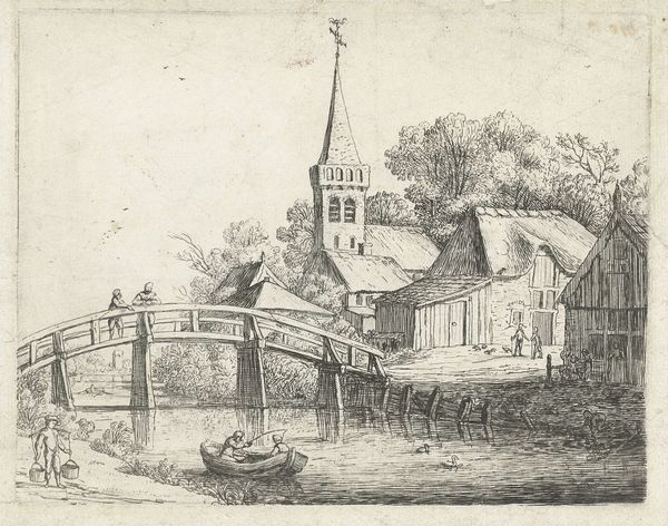 Curator: What a delicate and charming cityscape! Editor: It has a sort of melancholic beauty, doesn't it? The grey tones really set the mood. Curator: Indeed. What we are looking at is Domenico Quaglio’s "Landschap," created sometime between 1804 and 1821. It’s a remarkable etching—a pen sketch capturing a moment in time. Editor: The composition is striking. The way the artist uses light and shadow, particularly in the reflections on the water and textures in the foliage, create depth. Note how the buildings are meticulously detailed, yet somewhat softened, suggesting distance. Curator: Quaglio was very much a product of his time, deeply involved in the burgeoning Romantic movement. This cityscape really speaks to the Romantic era's fascination with picturesque scenery and an idealised vision of towns, even somewhat medieval towns. Editor: You can almost feel the stillness. The verticality established by the towering steeples and balanced with the horizontality of the bridge is really nicely done, creating this interesting grid of forms, isn't it? Curator: The very act of documenting and circulating such images, particularly etchings, allowed wider society to engage with these urban spaces. Views like these helped shape popular ideas about cities and heritage. Editor: It is like looking through a historical window. But also consider the tonal range—it's quite narrow. The whole piece hinges on a restrained use of blacks and whites, the contrast generating the atmospheric perspective. Curator: These subtle washes, gradations and shades provide that real tangible and sensory connection. This landscape isn't just seen; it's experienced. Editor: Absolutely, and those minimal forms and textures still suggest complexity. They are very efficiently used. The bridge becomes a compositional focus in linking the buildings and trees. I can look at it for quite some time. Curator: It's interesting to consider how images like this influenced architectural preservation and even tourism during that period. Romanticism really fuelled this idea of 'heritage'. Editor: It really speaks for itself, beyond any interpretation, no? Its visual organisation communicates across time. The visual architecture invites us into its aesthetic world.