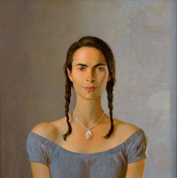 Editor: Here we have Michael Cheval’s "Queen of Spades," an oil painting from 2019. There's something so compelling about the contrast between the realistically rendered figure and the almost dreamlike, surreal elements like the flat black circle behind her head and the playing card she's holding. How do you interpret this work, considering its formal qualities? Curator: Well, let's consider the juxtaposition of textures and forms. The richly textured gold background contrasts sharply with the smooth skin of the subject and the crisp lines of her attire. Observe how Cheval utilizes geometric shapes - the stark circle, the rigid lines of her jacket, versus the softer, flowing lines of her skirt and scarf. The painting plays with the tension between hard and soft, structured and organic. How does this opposition affect your reading of the "Queen?" Editor: I think it creates a sense of controlled chaos. Everything is meticulously rendered, yet the composition feels unsettling. The heavy use of complementary colours, like the blues and golds, adds to that visual tension, doesn't it? Curator: Precisely! Furthermore, notice the symbolic use of the spade motif throughout. The scarf, adorned with spades, leads our eye down to the actual playing card, which appears to be the nine of diamonds. Is there a specific story being implied by the presence and prominence of this suite? Editor: I hadn’t noticed the significance of the nine of diamonds. The overall visual language is quite sophisticated! Curator: Indeed. Cheval's strategic combination of realistic technique with surreal elements pushes us to consider the construction of meaning itself, prompting a deeper engagement with its components, even beyond any narrative context. Editor: I see what you mean. Analyzing the formal elements provides a completely different understanding. Curator: It's like deconstructing a puzzle. Each element contributes to the overall impact and interpretation.