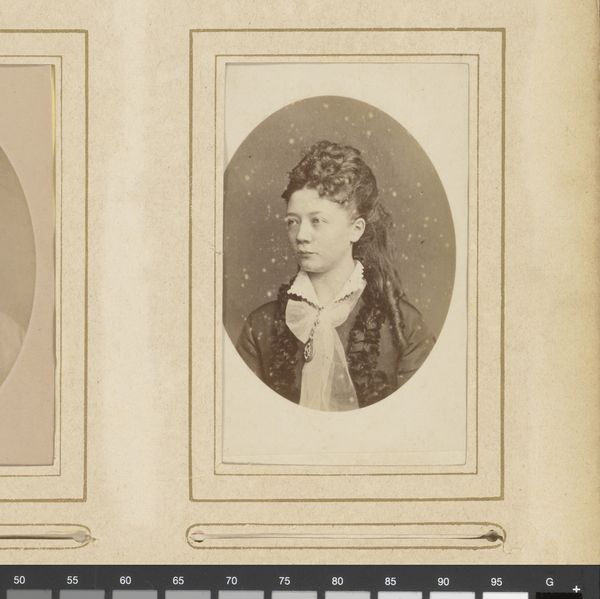 Curator: Before us is "Portret van een jonge vrouw," or Portrait of a Young Woman, a gelatin-silver print dating from between 1861 and 1874 by Albert Greiner. Editor: It’s strikingly ethereal. The limited tonal range, verging on monochrome, creates an atmosphere of quiet contemplation, almost like a faded memory. Curator: The oval brooch she wears might signal familial affiliation, the passing down of heirlooms that root identity through material objects, don't you think? Consider how portraiture functions to solidify social status and familial lineage during the period. Editor: The tight crop of the portrait is rather clever too. The edges create these perfect geometric shapes – crisp rectangles—which make the subject's soft organic forms even more pronounced. Her almost defiant curls disrupt an otherwise ordered appearance. Curator: The woman's pose feels intentionally restrained, conveying a controlled image in a society emphasizing feminine decorum. Note also the subtle hand-coloring, or lack of it, likely hinting at the financial status of both the sitter and commissioner. It suggests modesty and, paradoxically, a quiet affluence. Editor: Yes, the negative space actually plays a powerful role here. It surrounds her figure and draws the eye towards her face, creating a focal point where her features command the viewer’s full attention. Curator: Think too, how photography offered the rising middle class access to portraiture. It became a form of personal archiving, freezing specific moments. What stories would she be able to tell? How is youth presented here? Editor: Looking at the sharp, formal qualities and their starkness makes it all more curious as to why it evokes such a soft response in me. The play of lines keeps pulling me in! Curator: In a way, it feels like we’re glimpsing into a hidden world, made tangible through a photographic record. Editor: Yes, that’s it, a world captured in a seemingly objective manner, yet infused with subtle compositional choices that mold the narrative and feeling.