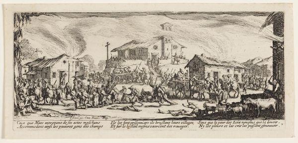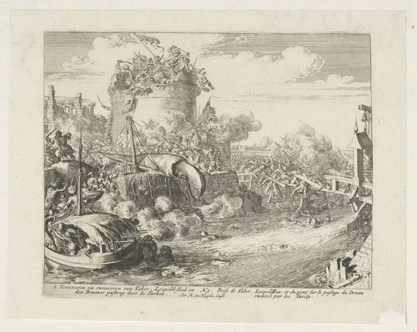 Curator: Romeyn de Hooghe created this engraving titled "Loopgraven van de Turken voor Wenen," or "Trenches of the Turks before Vienna," in 1684. The Rijksmuseum houses this compelling piece. What strikes you first about it? Editor: It's gritty. Chaotic, even. The smoke billows, the lines are hurried, and there's this immediate sense of unease… like you’re right there, amidst the siege. I can almost smell the gunpowder. Curator: Precisely! The dynamism is striking, especially considering the medium. As an engraving, it relies heavily on line and texture to convey movement and the complexities of warfare. Note the sheer amount of labour visualized, both human and animal power used to transport artillery. Editor: It's not just about high art, is it? There’s something raw in the way De Hooghe depicts these siege lines. He really lays bare the grunt work, the supply lines…it's not just about the glory of battle, but the absolute means by which it’s waged. And the camels! Such fascinating details… makes me wonder about the cultural exchange – or rather, clash – that fueled these conflicts. Curator: Indeed. He provides visual access to labor, consumption, and imperial competition during the Baroque era, showing how advancements in artillery influenced the labor needed in military campaigns. It shifts the focus from the heroics of the commanders to the actual labor required. It is an impressive statement on the nature of military production. Editor: The more I look, the more I see, not just smoke and cannon fire, but something about resilience too. Vienna stood its ground, and even through this chaos, that underlying strength pulses through the image. A brutal scene, undeniably, but it holds this strange, defiant beauty as well. It invites contemplation on human capability, the grim side and perhaps... the inspiring side? Curator: Well said. De Hooghe, whether intentionally or not, allows for such readings. The historical weight mixed with an engagement in the messy business of material processes generates the piece’s resonance for contemporary viewers, still. Editor: Absolutely. It's a lot more than just an old battle scene isn't it. More of a mirror...reflecting our ongoing obsessions and concerns with power, process, and survival.