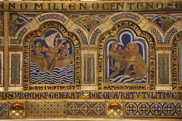 Editor: This vibrant, miniature enamel panel, “The Killing of Abel,” by Nicholas of Verdun, dating back to 1181, feels surprisingly dynamic for a medieval work. I’m immediately struck by the intensity of the scene, amplified by the small scale and rich colors. What do you see in this piece, especially concerning its historical and symbolic context? Curator: Indeed. Its jewel-like quality draws us in, but consider the visual vocabulary at play. We're seeing more than just a biblical narrative. The gold figures against the deep blue create a stark duality, highlighting the primal conflict between good and evil, Cain and Abel. Note how Cain's action lacks any emotional weight—it's rendered as a function rather than a personal decision. Think about the symbolic weight of fratricide; what collective anxieties about societal breakdown might it be tapping into for a 12th-century audience? Editor: So the stylized presentation and vivid colours aren't just decorative; they're reinforcing the weight of this foundational story, emphasizing not only the act, but also its profound implications. The figures seem intentionally depersonalized, like symbols in a larger allegory? Curator: Precisely! They are enacting roles within a cosmic drama. And the luxurious materials used – the gold and enamel – elevate the story, lending it an aura of divine importance. This panel served a didactic purpose; it would teach, warn, and remind the faithful of their moral obligations. Consider the deliberate pairing of luxury with brutality. How does this visual tension contribute to the artwork’s overall meaning and purpose? Editor: It’s fascinating to see how seemingly simple visual choices, like colour and material, become so potent in conveying complex ideas. I'm struck by how powerfully visual symbolism can communicate a story’s emotional core, spanning centuries and cultural shifts. Curator: Absolutely. And understanding those symbols opens a window into the minds and beliefs of people long gone, echoing through cultural memory.