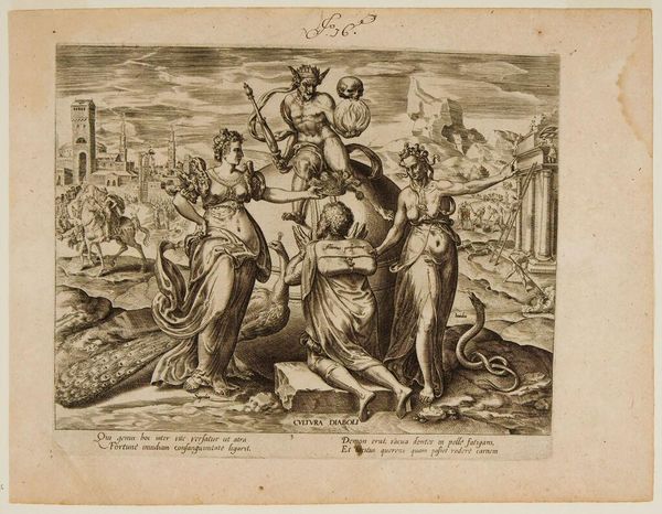 This etching, titled 'Man undressing woman' resides in the Rijksmuseum. Its intimate scale, barely 10cm across, invites a close inspection of its intricate lines and shading, framed within an oval border. The composition stages a scene of undress, yet the surrounding landscape and distant architecture lend an air of theatricality to the encounter. The figures, rendered with meticulous detail, seem caught in a moment of negotiation. The lines are precise, the contrast stark, emphasizing the textures of fabric and skin. A flag in the background adds a sense of irony and ambiguity to the subject. Structurally, the image teeters on the edge of eroticism, but never fully succumbs. The overture suggests a space in which desire is negotiated. The frame creates both a sense of containment and of setting the scene. Ultimately, this small print speaks to the shifting boundaries between public and private, desire and restraint, inviting viewers to consider the complex interplay of power and seduction.
