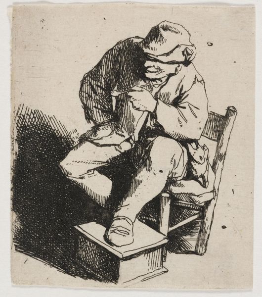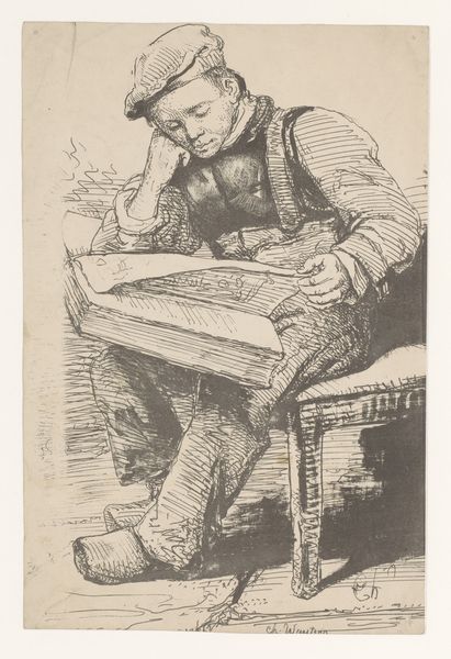 Editor: Here we have Van Gogh's "At Eternity's Gate," created in 1882. It’s a monochrome print or drawing of a man sitting on a chair, head in his hands. It feels very raw and immediate to me. What draws your eye when you look at this work? Curator: Immediately, the intense focus on the figure's posture and dress. We see the physical manifestation of grief rendered in the simple act of production: a man, a chair, paper, ink. It brings up the social conditions that might lead an artist like Van Gogh to focus on such a subject and, perhaps, his own state of being. What was the process of making such a drawing for him at that point in time? Editor: That’s interesting. So you’re focusing on the…labor, essentially, that went into this image. Curator: Exactly. We should look into the materiality of the work itself – what kind of paper, the nature of the ink. Was this a quick sketch made for practice, a drawing destined to be reworked into a painting, or a finished work to be sold? All this is crucial. What purpose would it have served for Van Gogh at that specific juncture of his life and career? The tools he used and how accessible and precious were they. What statements was he making through the subject in relation to what he had available? Editor: I hadn’t considered that before. It makes me wonder about the sitter, too. What can we tell about this man’s social standing from his clothing, and his posture? Curator: Indeed. The worn clothing and the palpable despair hint at the sitter's socio-economic condition, reflecting a critical engagement with social realism prevalent during that era, an insight into the culture of work at the time. Do we know who posed for it? That information matters greatly, influencing its narrative. Editor: I see what you mean. Thinking about it this way definitely sheds light on it beyond just the surface level. It shows how the making is closely tied to what he wants to show us. Curator: Precisely. It really helps us challenge the notion that this is merely an image of sadness, as you said initially.