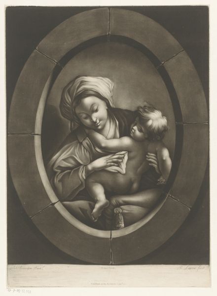 "Madonna della Sedia" was created by Pieter van Schuppen sometime in the 17th century. It's an engraving that captures the Virgin Mary embracing the infant Christ. During this period, depictions of the Madonna and Child were not just religious symbols; they often reflected broader societal values around motherhood and family. Schuppen, working within this tradition, presents a scene that emphasizes tenderness and maternal love, ideals deeply embedded in the cultural fabric of the time. Yet, we might also consider how these images, while seemingly universal, are rooted in specific cultural and class perspectives. The idealized portrayal of Mary can be seen as both a celebration of motherhood and a construction that reinforces certain expectations of women. This artwork serves as a reminder of how deeply intertwined art is with the social contexts from which it emerges. It invites us to reflect on the stories we tell about ourselves and each other.